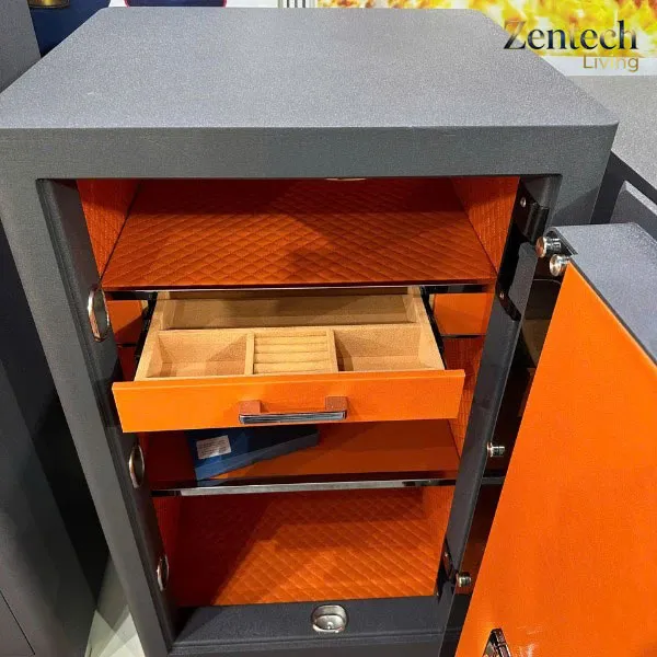 Ngăn kéo phía trên có thêm mật mã đơn giản giúp tăng tính riêng tư. Ngăn lớn bên dưới được chia tầng linh hoạt để người dùng cất giữ tài liệu, sổ sách, tiền mặt hoặc đồ giá trị một cách ngăn nắp hơn. Phần nội thất bọc da chống xước cao cấp mang lại cảm giác sang trọng, chỉn chu và nâng tầm đẳng cấp cho toàn bộ sản phẩm.